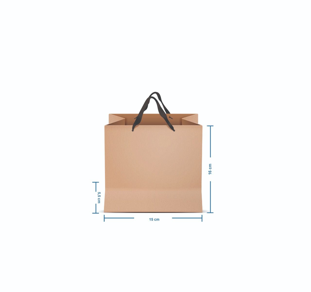 Sacola em papel Kraft Vertical - Medidas LAP: 16 cm de largura x 15 cm de altura x 5,5 cm de profundidade